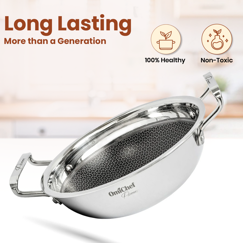 Triply Stainless Steel Honeycomb Kadhai With Steel Lid 1.7L/2.1L/3L/4L/5L, Premium Quality, 3 Layer Thick Body, 100% Toxin-free, Non-stick, Induction & Gas