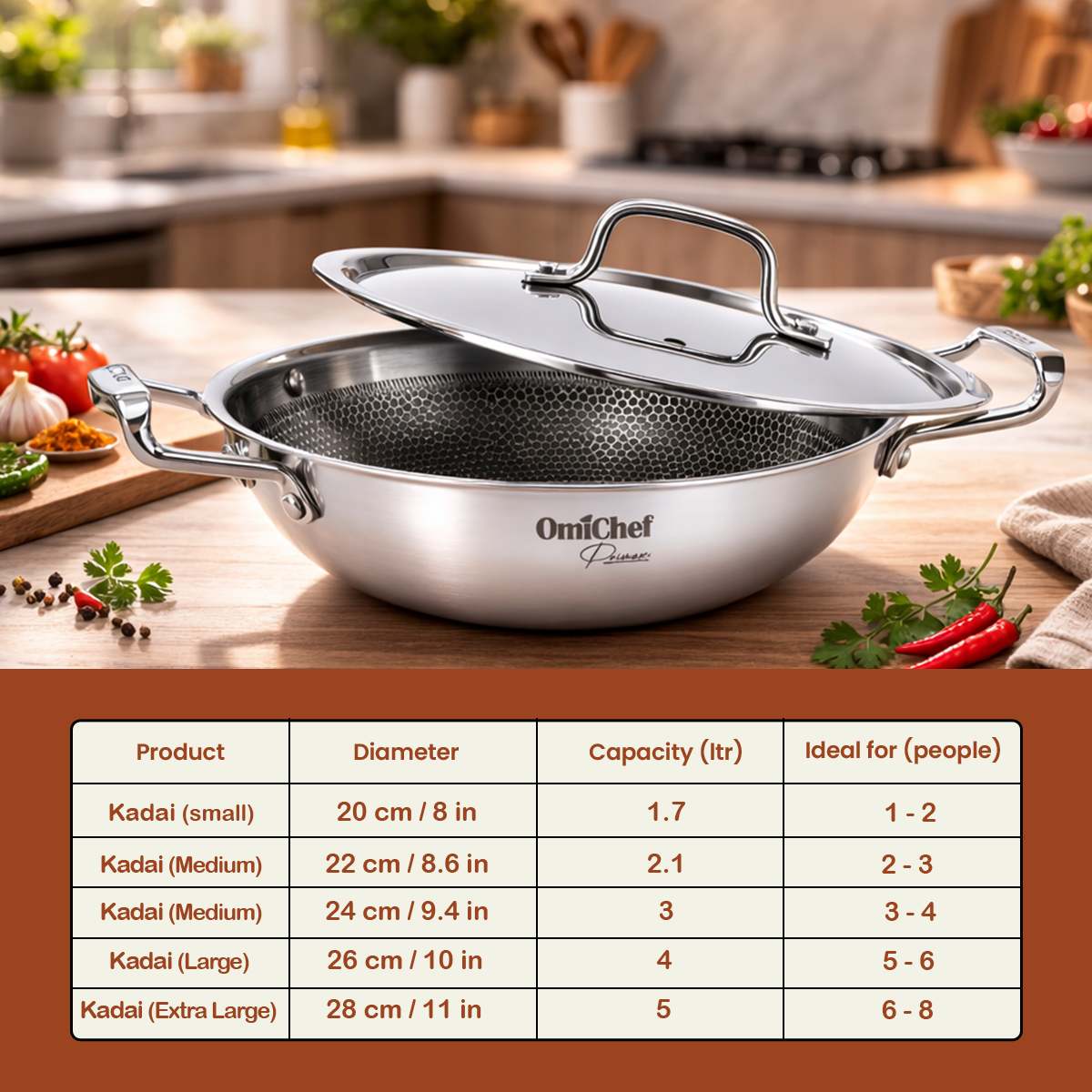 What sizes and capacities are available for the Omichef Honeycomb Triply Stainless Steel Kadai?